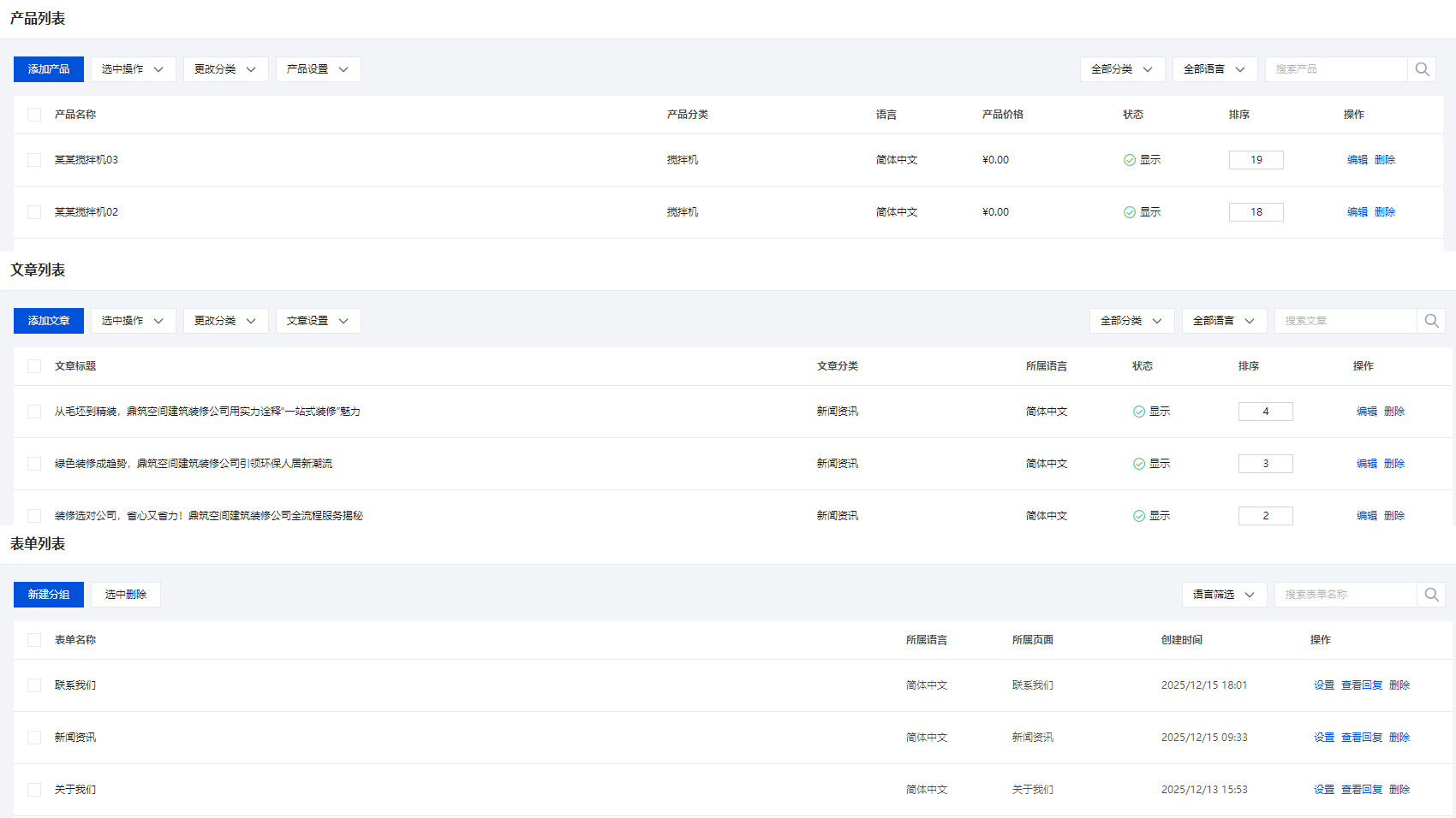 模块化后台结构,所有内容一目了然;页面管理、产品管理、文章管理、表单管理高效顺畅,支持一键上架、编辑、排序,轻松应对日常更新。